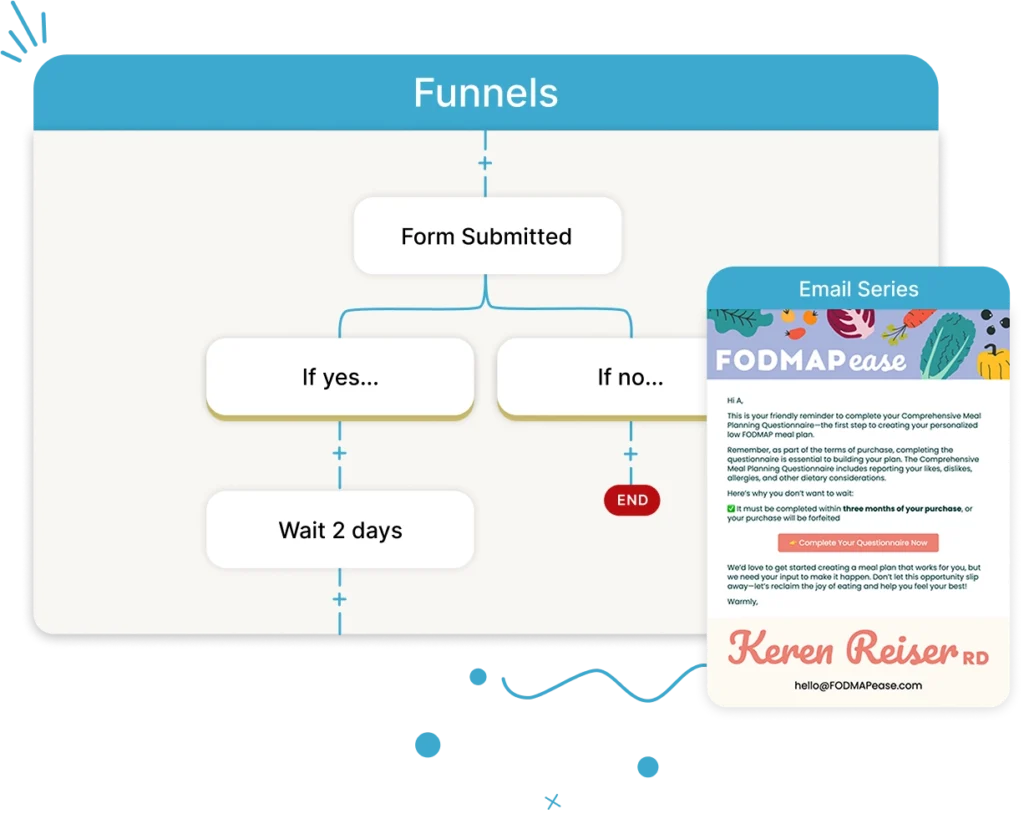 Replace your complex tech stack with one system built especially for nutrition practices. Attract clients, automate follow-ups, and scale with confidence—all from a single dashboard.